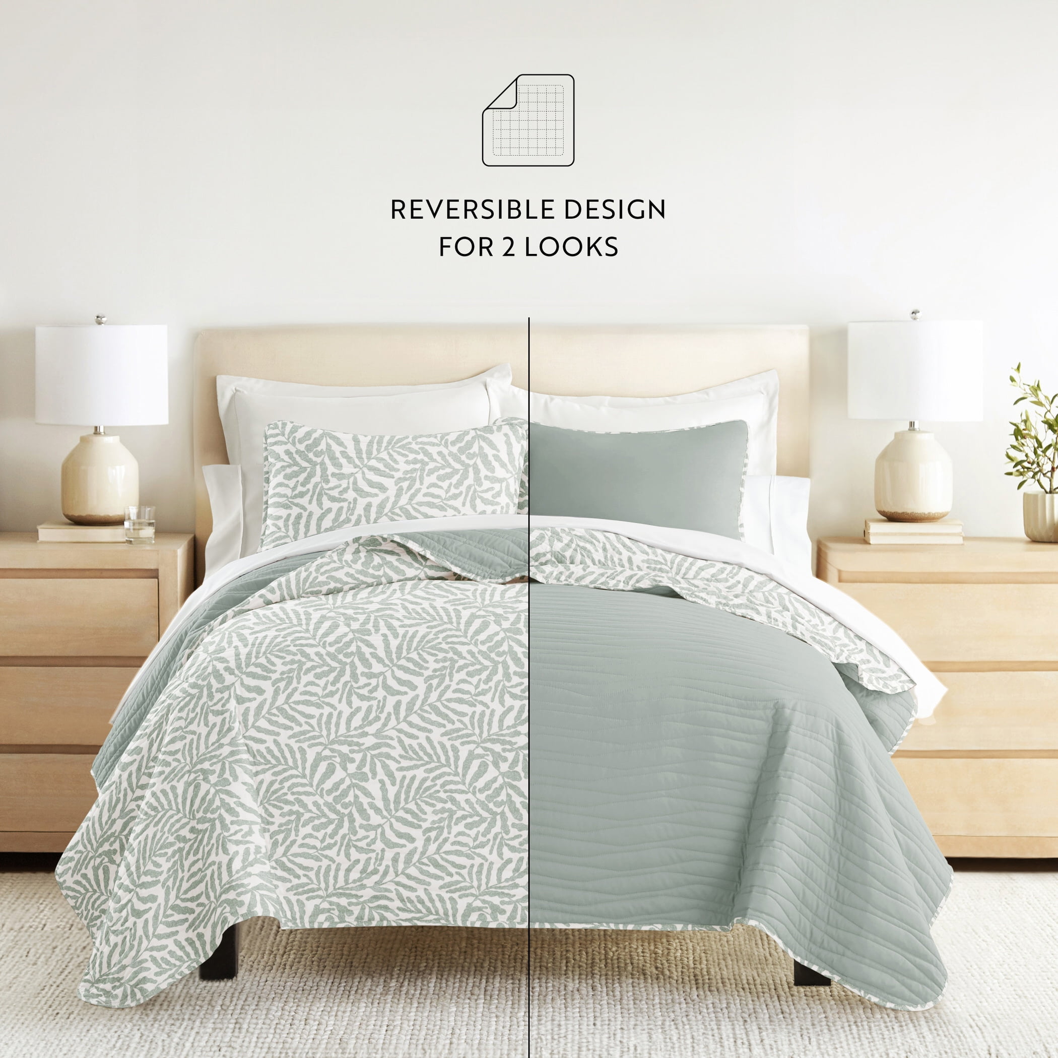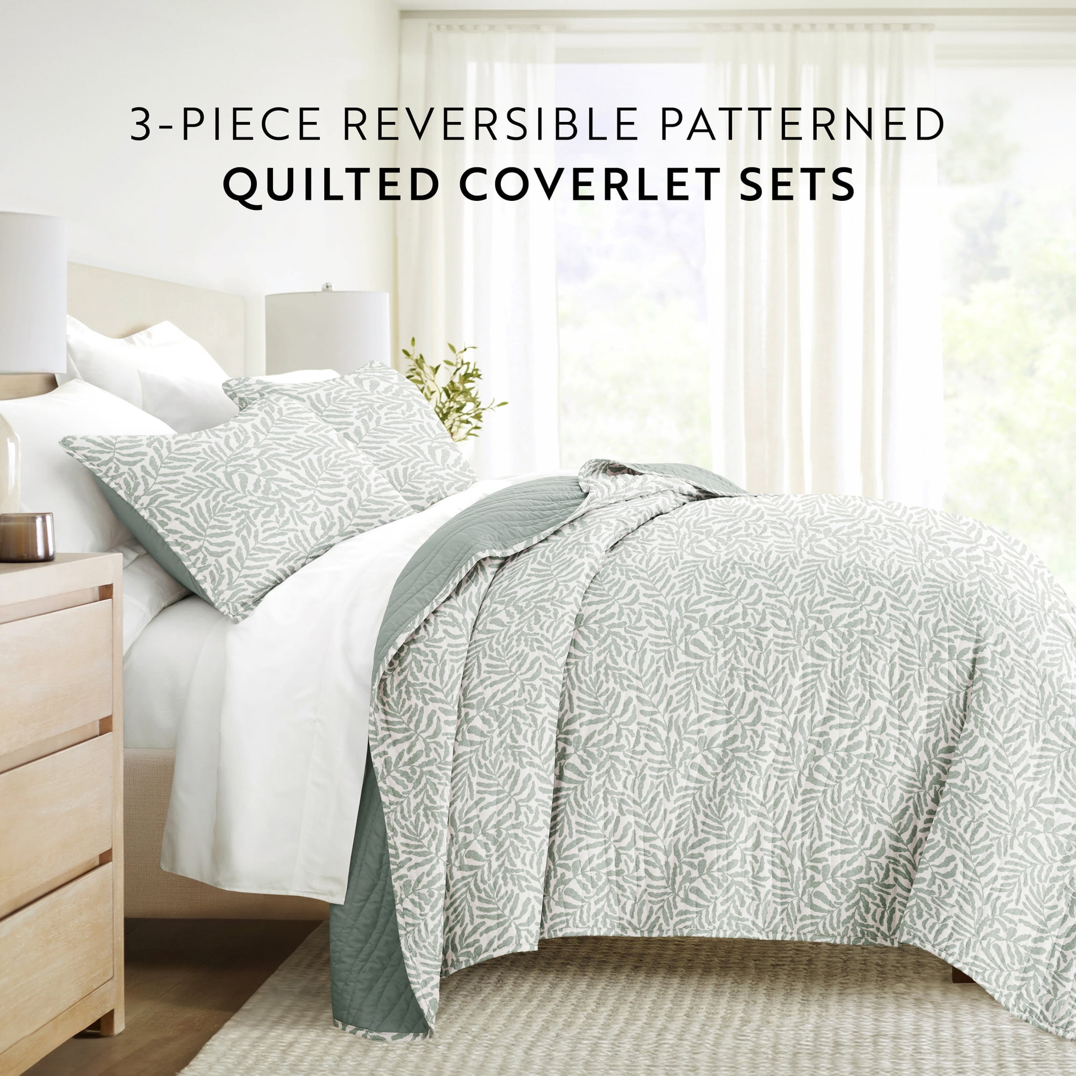 Noble Linens 3-Piece Eucalyptus Tossed Ferns Reversible Quilt Set, King