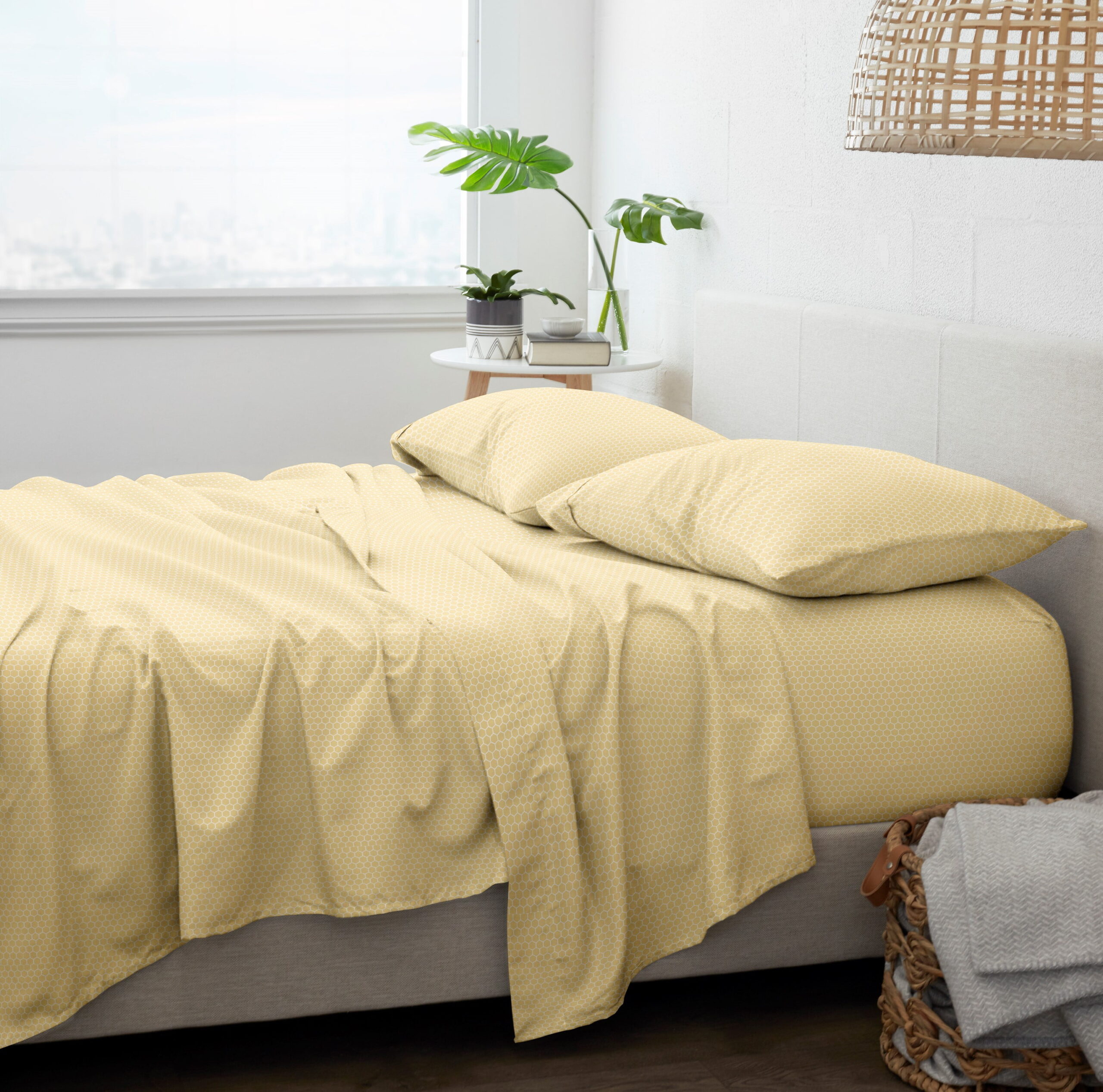 - This double-brushed patterned microfiber sheet set is super soft to the touch and wrinkle-resistant. With premium yarns that are twice as durable as cotton, these sheets are at less risk of rips and wear. These sheets are ideal for sensitive skin and those with allergies. Available in a variety of unique designer prints and patterns, including florals, geometrics, and stripes, making it the perfect new addition to your room!