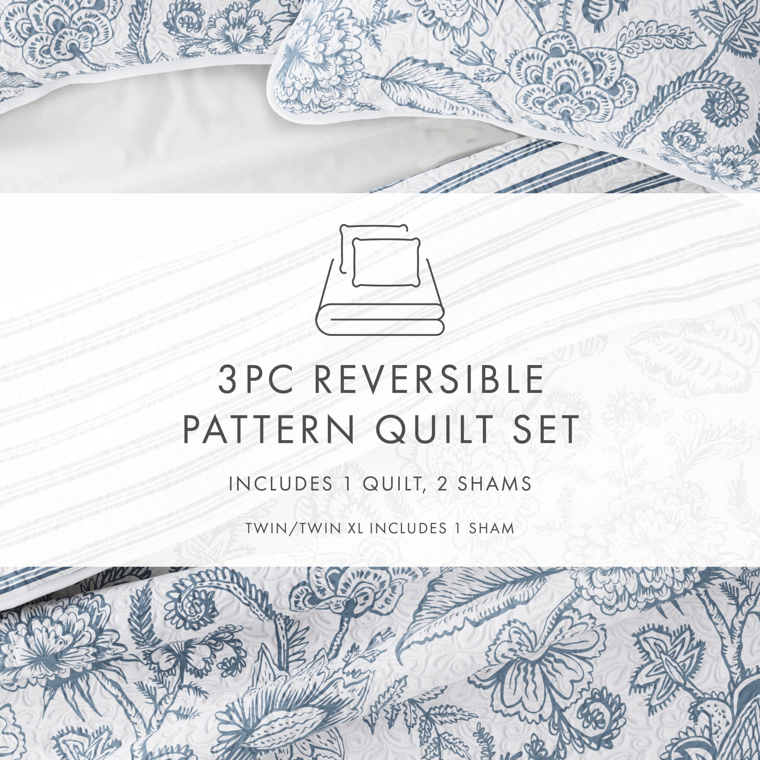 - TWIN/TWINXL: 1 quilt (70″ x 90″) and 1 pillow sham (20″ x 26″)