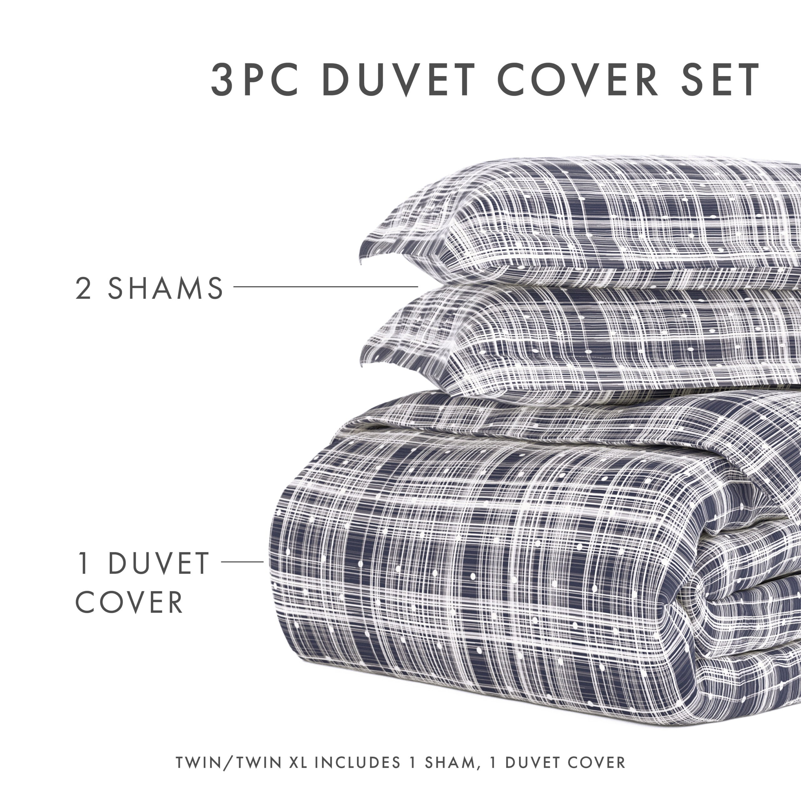 - TWIN/TWINXL: 70″ x 90″ Duvet Cover, 20″ x 26″ Pillow Sham with 2″ flange