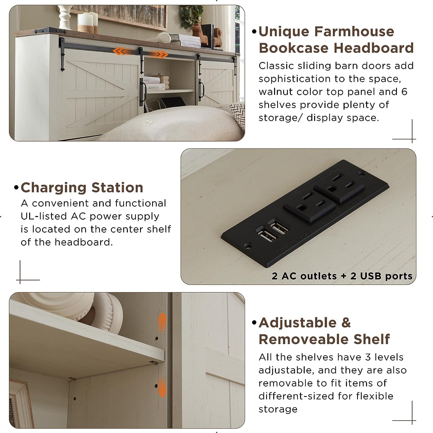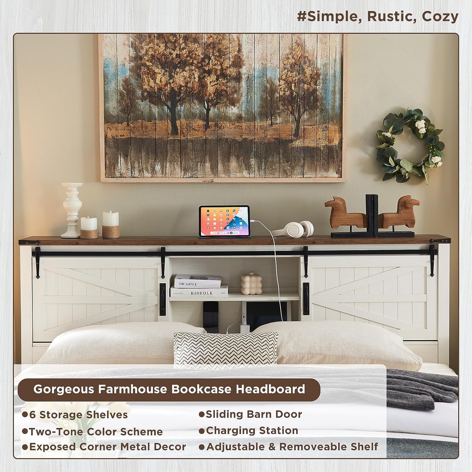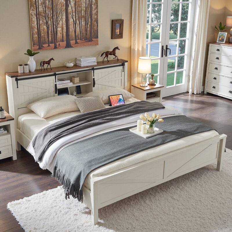 • Chic farmhouse headboard Design:  Classic sliding barn doors add sophistication to the space and allow you to hide clutter behind the doors, keeping the room neat and organized. Featuring a great fusion of farmhouse beauty and the utility of storage space.