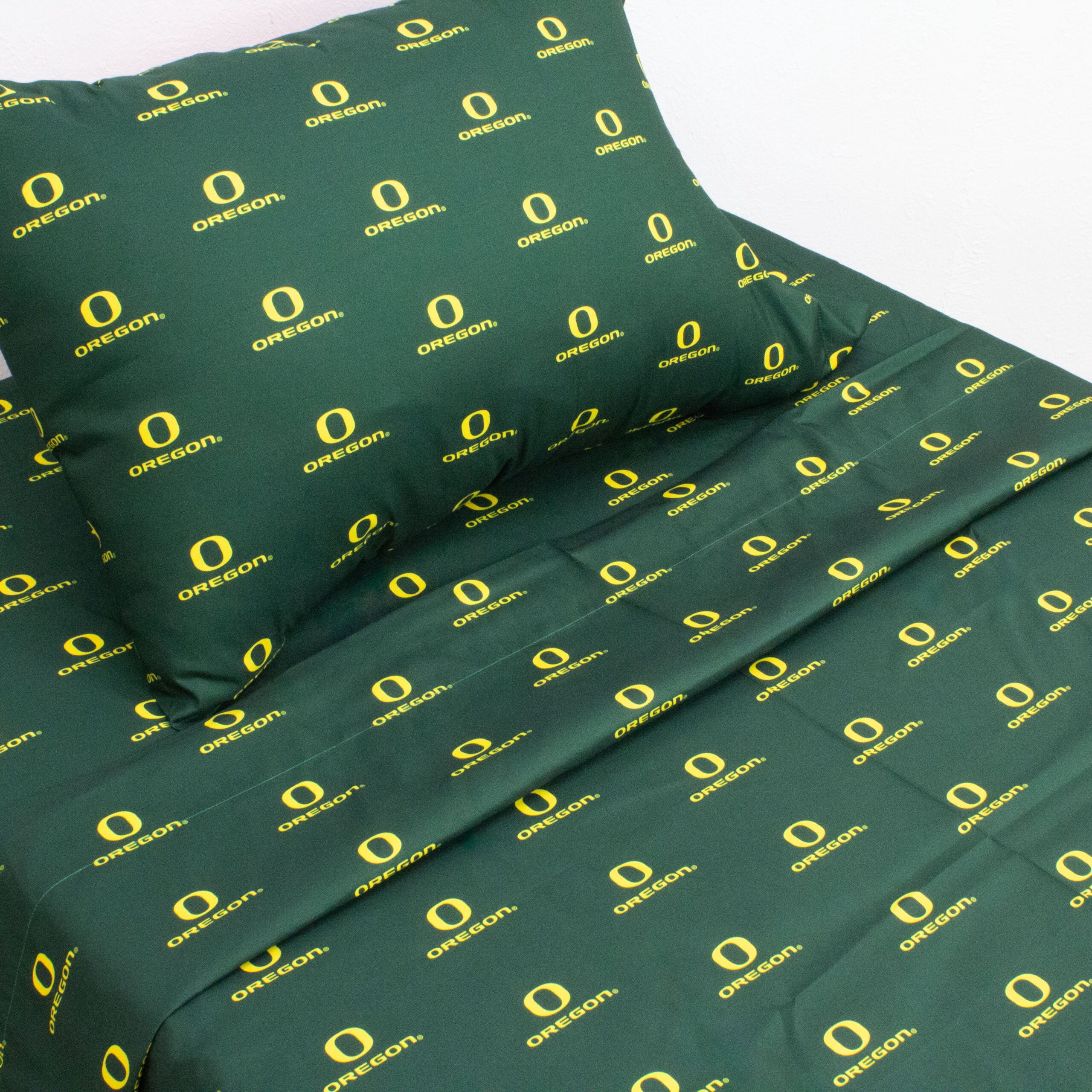 Oregon Ducks licensed, College Covers brand sheet set includes 1 flat sheet, 1 fitted sheet and 1 pillowcase. All made from 100 percent cotton, 200 thread count material, our sheets sets are machine washable with like colors in cold water and should be tumble dried on a low heat. The flat sheet measures 66 inches by 96 inches, the fitted sheet measures 39 inches by 75 inches by 12 inches deep to fit almost all mattresses. Imported.