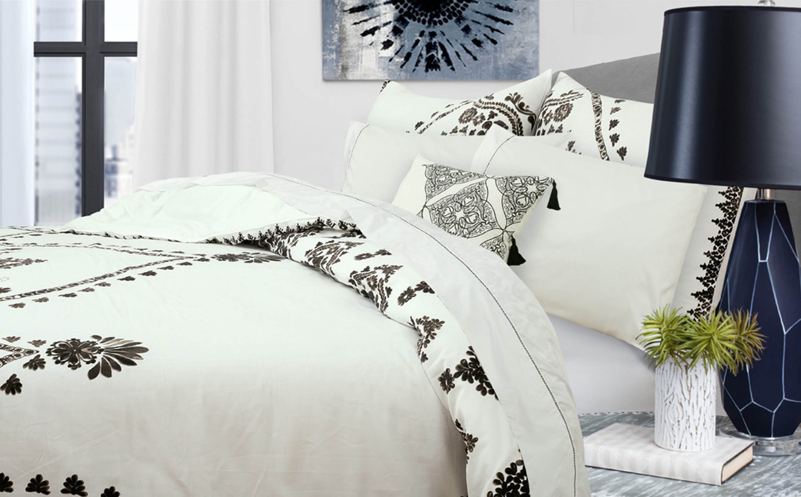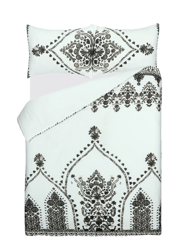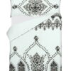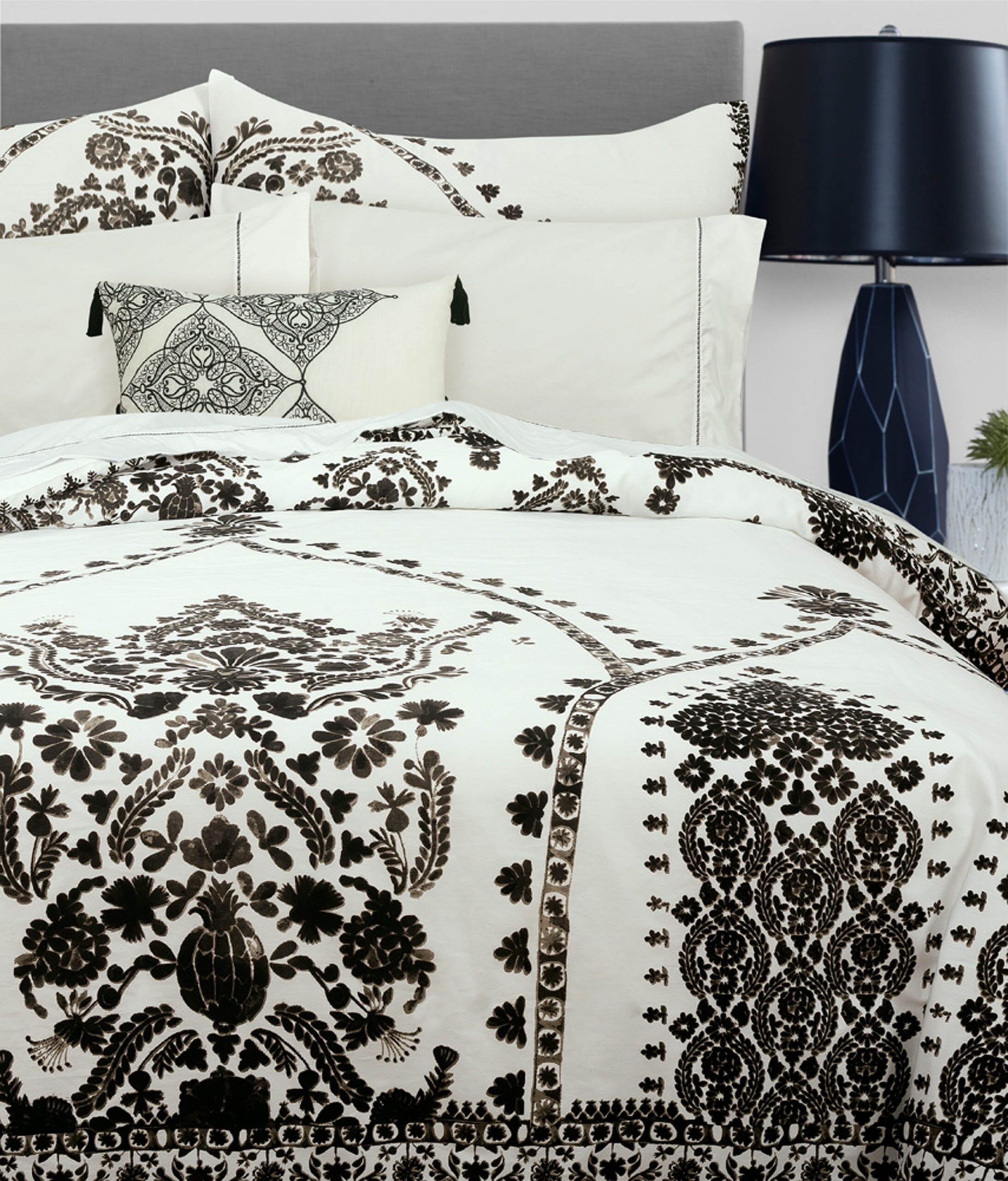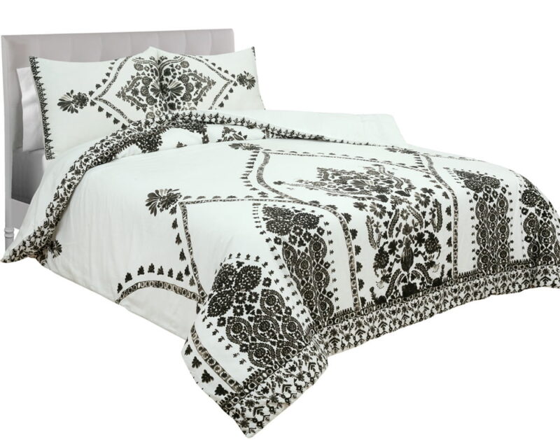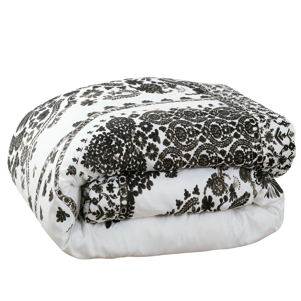 Nikki Chu Varanasi Comforter The Nikki Chu bedding collection features livable and natural looks with luxe touches to make your home feel inspired and effortlessly stylish. The Varanasi comforter and sham set features a global inspired stamped pattern in black, printed on a creamy White ground and reverses to a Solid creamy White. This beautiful bedding set will turn your bedroom into a serene and tranquil retreat, while its classic colors will match back to anyone’s décor. This comforter is perfect for anyone from a college student to a master bedroom. Finish the look or add style to any room in your house with the Nikki Chu embroidered window curtain panels, sold separately.