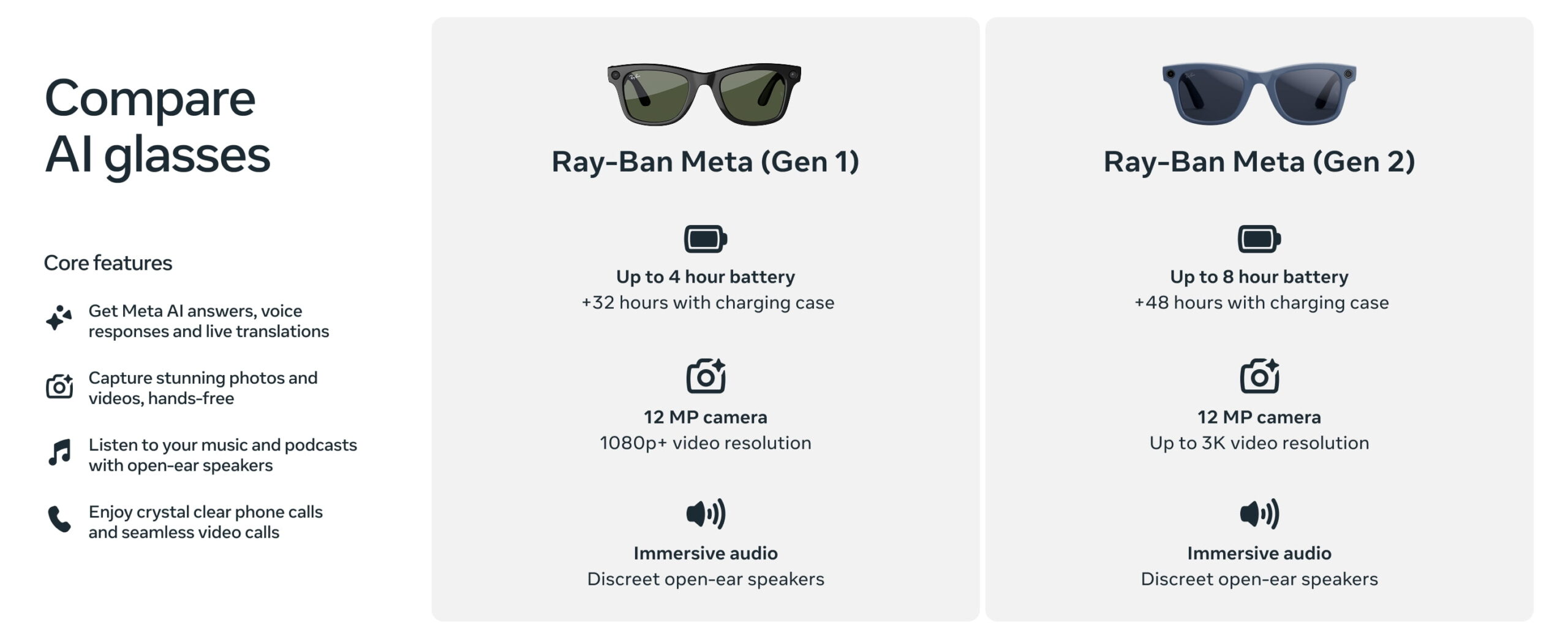 - Move effortlessly through life with Ray Ban Meta glasses. Capture photos and videos, listen to music, make hands free calls or ask Meta AI* questions on the go.