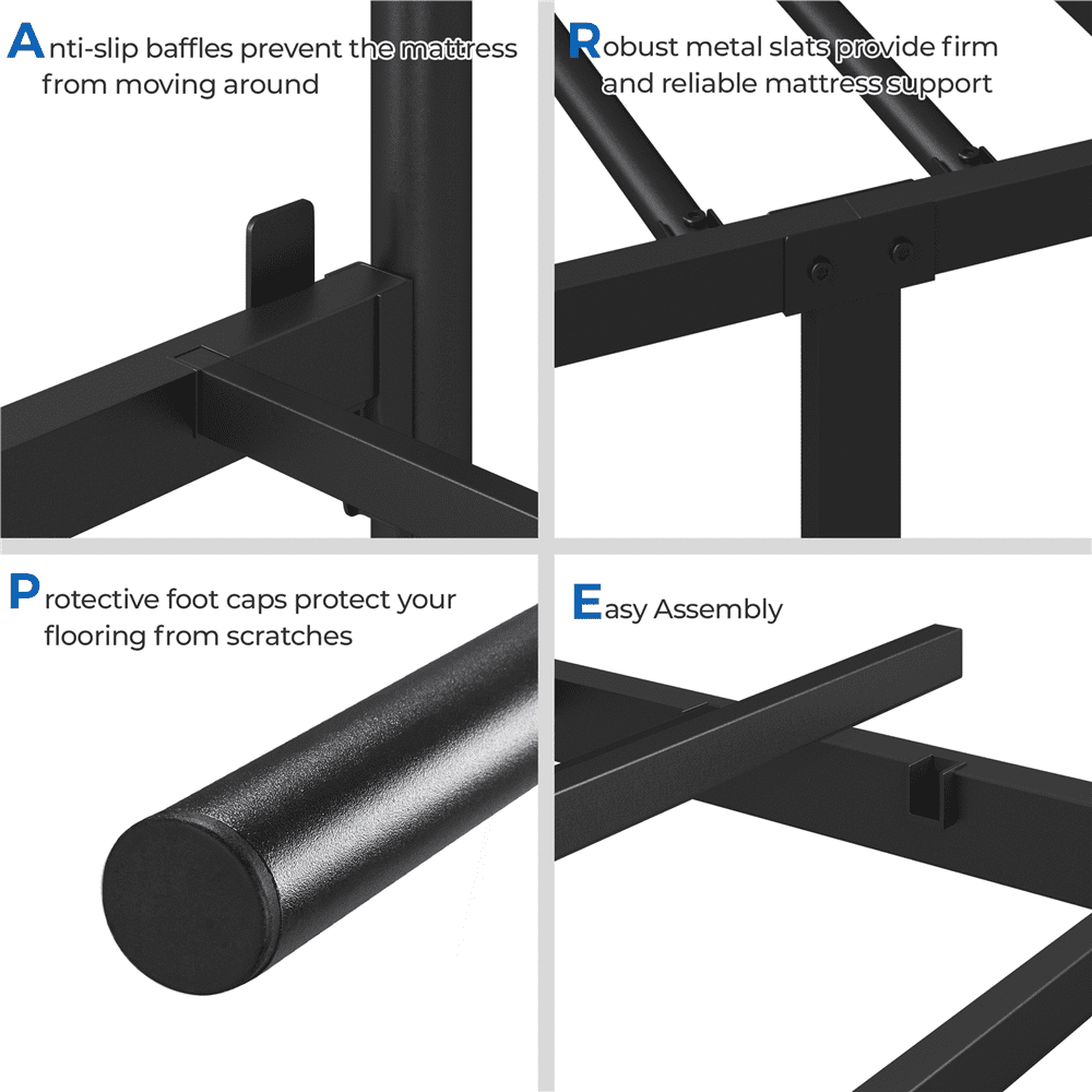 - Considerate Details: With years of bed manufacturing experience, we pay careful attention to every detail to ensure safe and comfortable use. The powder-coated surface resists rust and minor scratches, and the bottom rubber caps prevent friction noise and protect your floor.