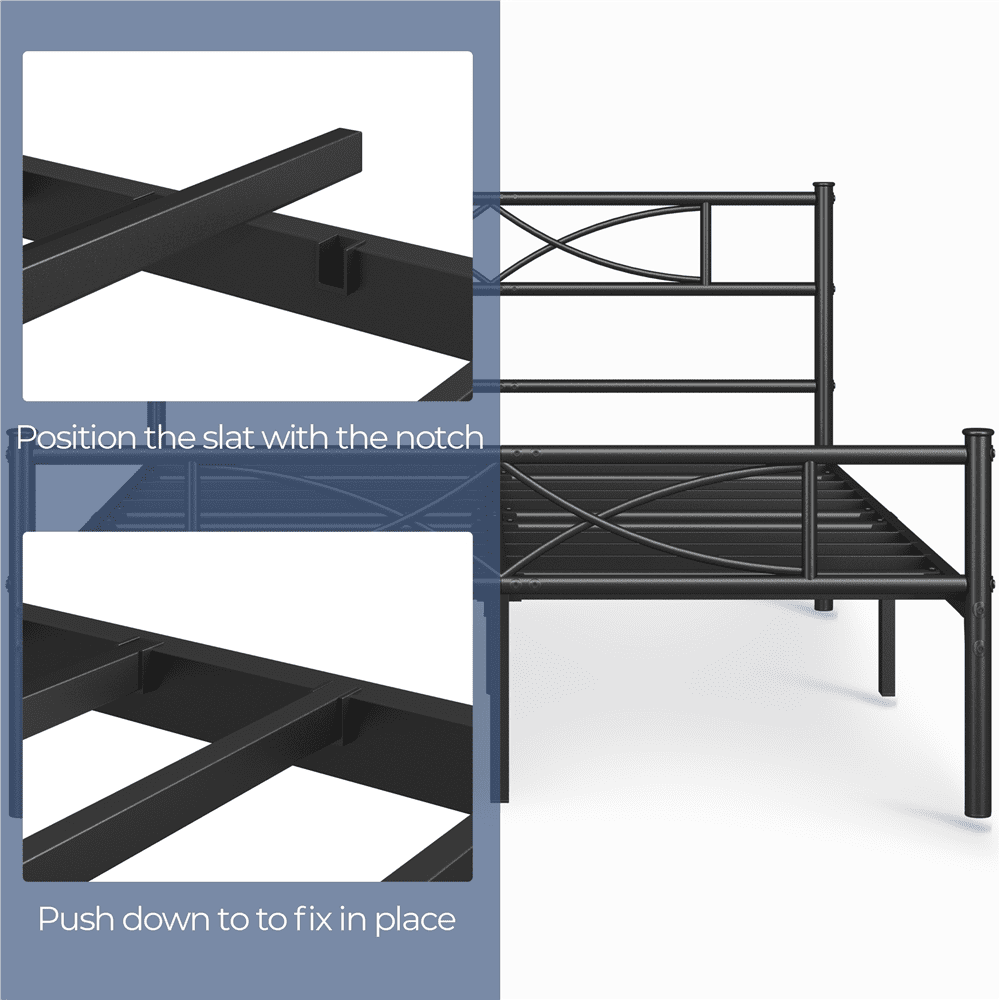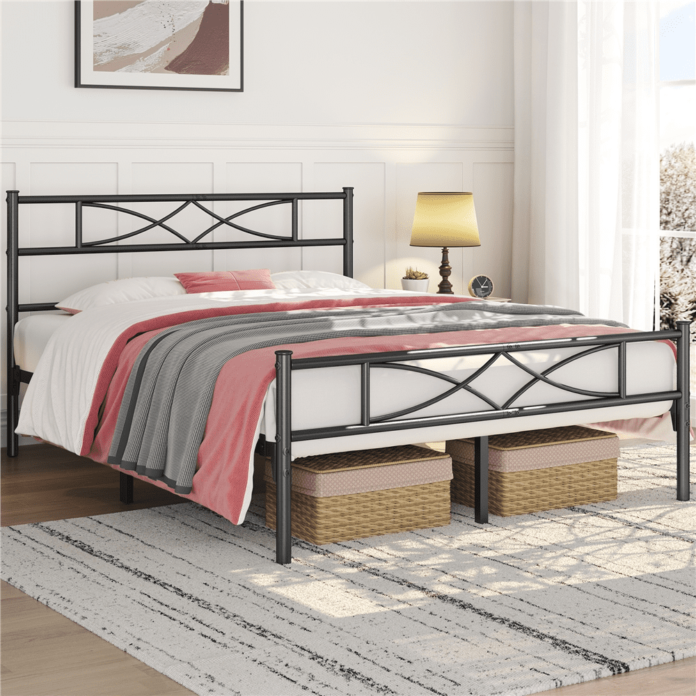 This queen size bed frame is built of metal slats, side rails and 10 sturdy legs, with a maximum weight capacity of 750 lb, ensuring a peaceful night’s sleep without being bothered by squeaky sounds. 12 built-in metal slats provide optimal support for your mattress and bedding (no box spring required). Thanks to its streamlined silhouette, classic curved lines and matte black metallic finish, this sturdy bed base will make a refined statement in your bedroom, guest room, dormitory, apartment and more.The iron platform bed frame stands 13”off the floor, allowing easy access to the boxes and baskets underneath, also making you effortlessly get into or out of the bed, which is ideal for Adult.
