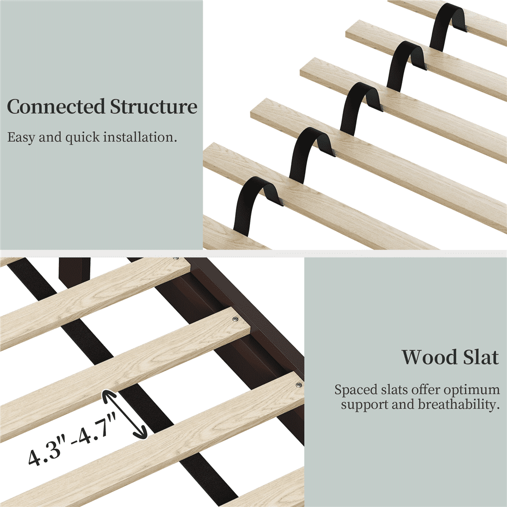 - Optimum Mattress Support: Ideal mattress ventilation is achieved through the use of spaced slats. The evenly spaced slats are positioned 4-4.3″ apart to enable air to flow freely, preventing heat from being trapped, ensuring a cool night’s sleep.