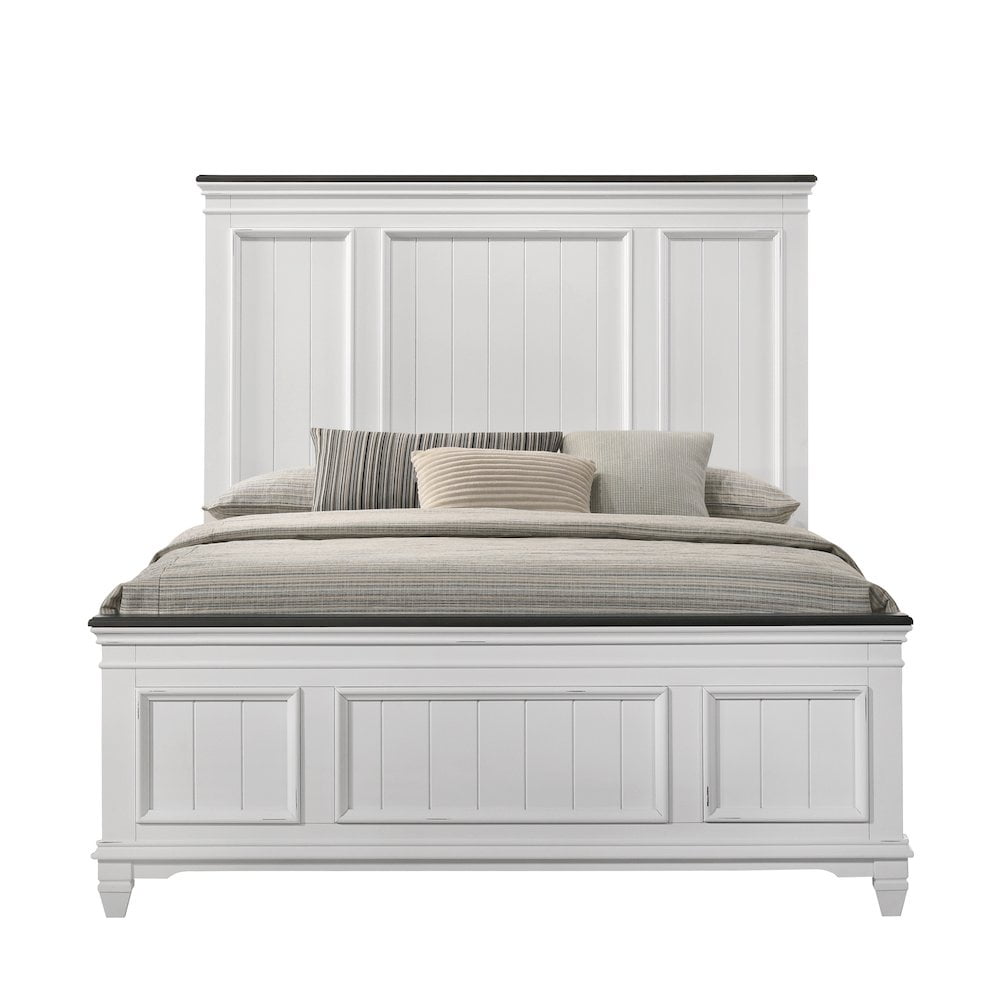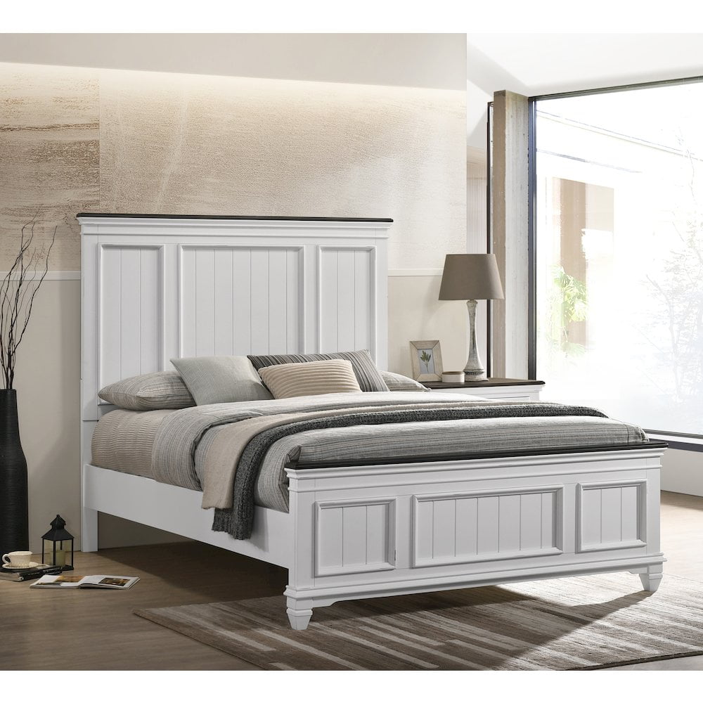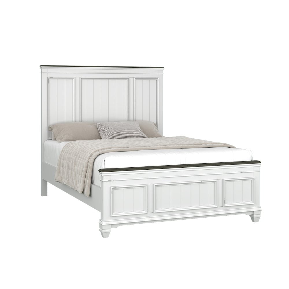 Contemporary shiplap detailing and a weathered white finish mean this Clelane Wood Panel Bed will give your bedroom a fresh new look. A stylish bed, this one is made of solid tropical wood and laminate with Okumin veneers in a charming weathered white finish. Chic shiplap panels inside carved details with trim molding on the headboard and footboard, matching with the dark Gray finished trim, highlighted with distressed mark to add a sense of modern farmhouse.