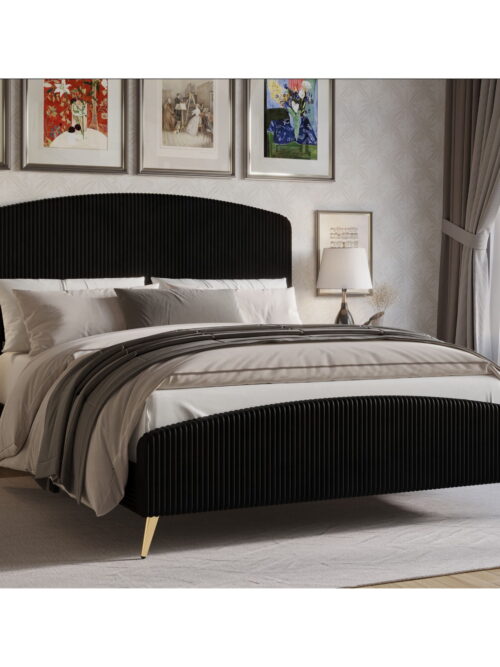 • Home Design Everett Full Upholstered Panel Bed Frame with Curve-Shaped Design Headboard For Adult, Black, Easy Assembly