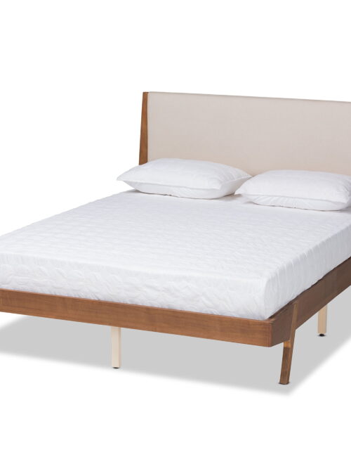 • Baxton Studio Sennae Mid-Century Modern Beige Fabric Upholstered and Walnut Brown Finished Wood King Size Platform Bed