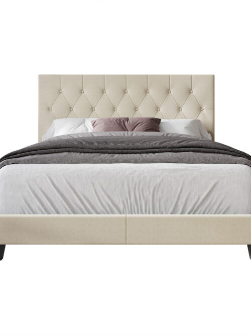 • Home Design Dillon Queen Tufted Upholstered Panel Bed Frame with Button Tufting and Foam-Filled Headboard, Beige, Easy Assembly