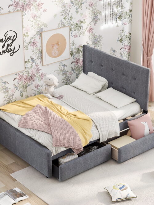 • EUROCO Queen Size Linen Upholstered Platform Bed with Two Drawers, for Adults, Gray