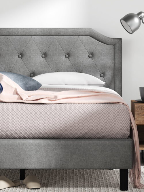 • Home Design Mason King Upholstered Platform Bed with Button Tufted, Bed Frame with Curved Headboard for Adult, Gray, Easy Assembly