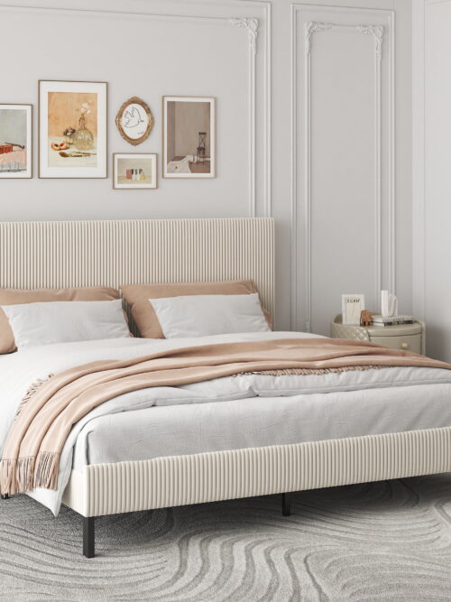 • Yoneston King Size Bed Frame with Bandaged Upholstered Headboard for Adults Bedroom No Box Spring Required Easy to Assembly, Beige