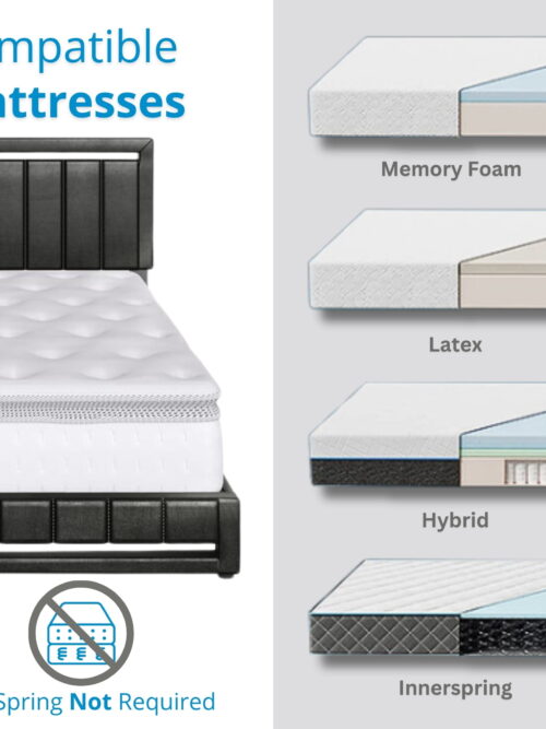 • Boyd Sleep Beaumont Black Faux Leather Queen Size Fully Upholstered Platform Bed Frame with Adjustable Headboard
