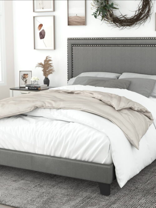 • Home Design Ocala King Upholstered Panel Bed Frame with Padded Headboard and Sturdy Support, Gray, Easy Assembly