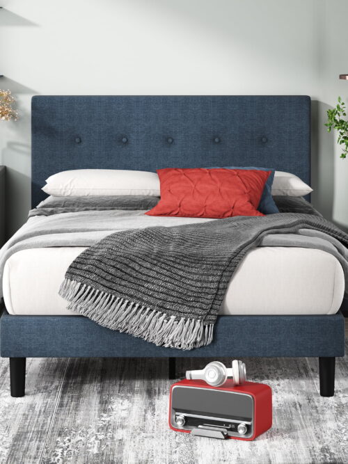 Zinus Omkaram 47″ Upholstered Navy Platform Bed, Queen