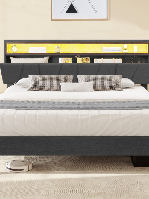• Dextrus Queen Size LED&Upholstered Headboard Bed Frame, No Box Spring Needed, Grey