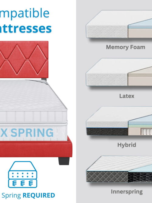 • Boyd Sleep Charlat Red Faux Leather Full Size Fully Upholstered Platform Bed Frame with Adjustable Headboard, Qualified Box Spring or Foundation Required for Use