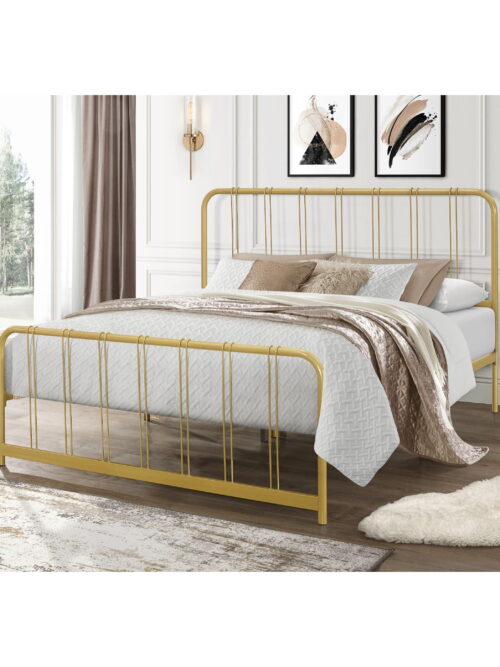 • Home Design Debra Queen Metal Platform Bed Frame with Sturdy Frame and Openwork Design, Gold, Easy Assembly