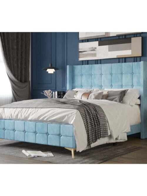 • Home Design Gisella Full Upholstered Panel Bed Frame with Headboard Wingback for Adult, Blue, Easy Assembly