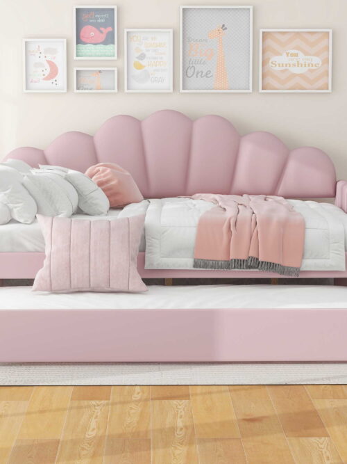 • EUROCO Upholstery Full Size Platform Bed, Upholstery Daybed with Headboard and Trundle for Kids,Pink