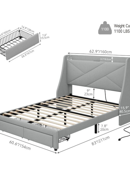 • Dextrus Queen Size Bed Frame with Type-C & USB Port and 2 Drawers,No Box Spring Needed, Grey