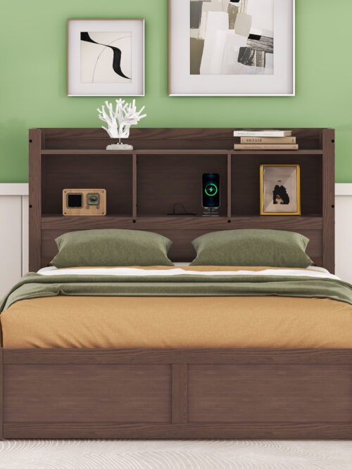 • Euroco Wood Full Size Platform Bed with Movable Shelves, Trundle Bed with USB Charging Station for Kids Teens, Espresso