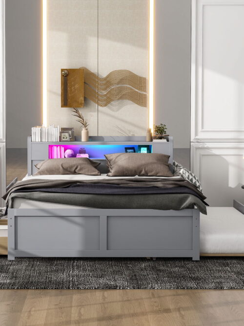 • Euroco Wood Queen Size Platform Bed with Storage Headboard, Drawers Trundle and LED Light, Gray