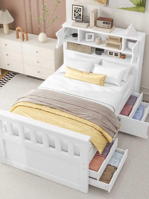 • Euroco Wood Twin Size Platform Bed with Storage Headboard, Captain Bed with 4 Drawers, Bookcase and Cabinets for Kids Teens, White