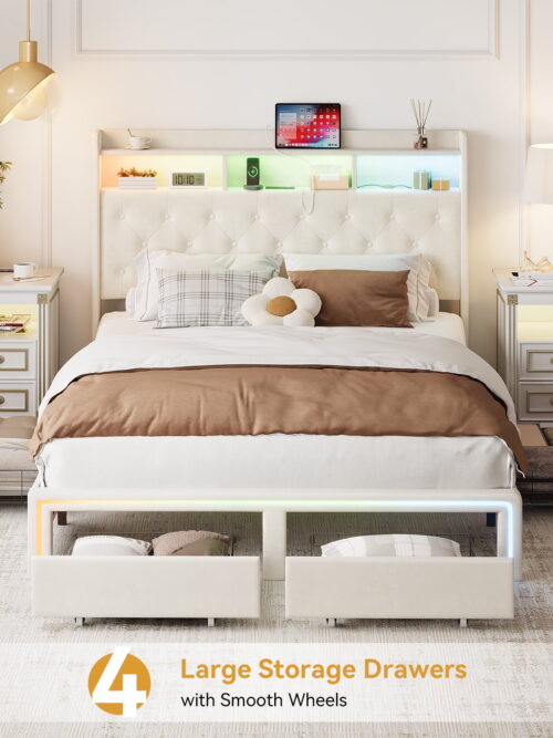 • Miniyam Full Size LED Bed with Storage Drawers, Charging Ports, Velvet Headboard for Adults, Beige