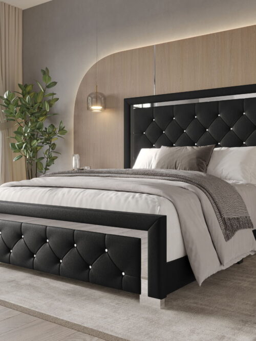 • Home Design Toccoa Queen Upholstered Panel Bed Frame with Diamond Button-Tufted Headboard and Silver Metal Accents, Black, Easy Assembly