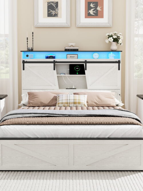 • Miniyam Full Size Farmhouse Bed with Storage Headboard, USB & Type-C Ports, LED Lights, 2 Drawers for Adult, White