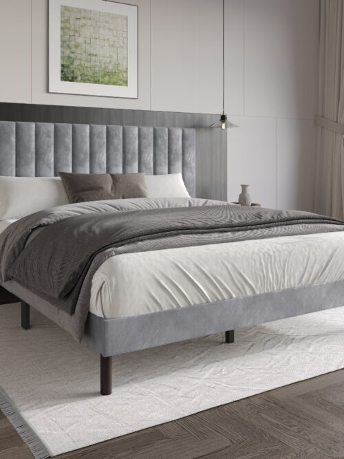 • Home Design Sitka Twin Velvet Upholstered Platform Bed Frame with Channel-Tufted Headboard & Foam Padding, Silver Gray, Easy Assembly