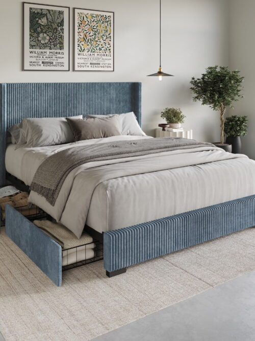 • Home Design Rochester King Upholstered Storage Platform Bed Frame with Wingback Headboard and Four Under-Drawers, Blue, Easy Assembly