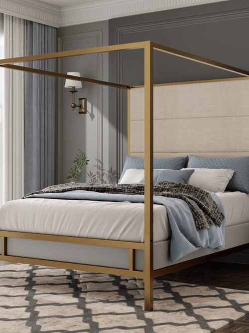 Euroco Metal King Size Canopy Bed with Upholstery Headboard, Gold
