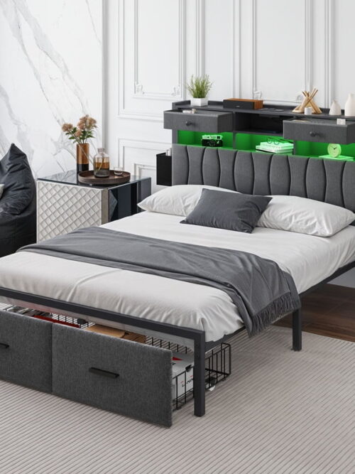 • Uforic Full Upholstered Bed Frame with Charging Station, LED Platform Bed with Storage Drawers, Gray