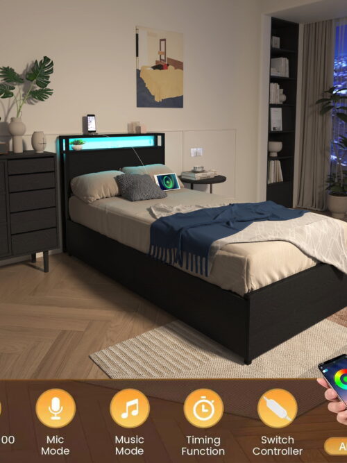 • Miniyam Twin Size Bed with Storage Drawers, LED Lights, USB Charging Headboard for Teen, Black