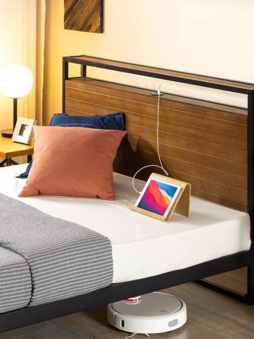 • Zinus Suzanne 39" Bamboo and Metal Platform Bed Frame with Shelf and USB Ports, Adult, Queen