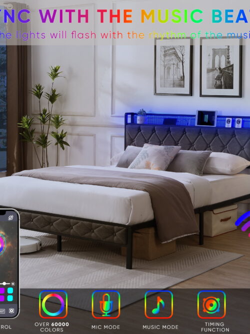• Miniyam Queen Size Upholstered Platform Bed Frame with 3 USB Ports & LED Lights for Adult, Light Gray