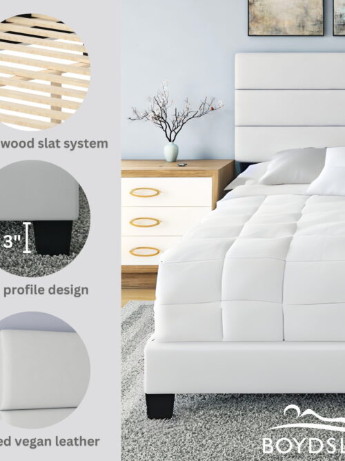 • Boyd Sleep Piedmont White Faux Leather Queen Size Fully Upholstered Platform Bed Frame with Adjustable Headboard