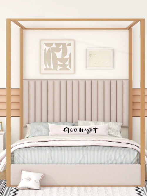 • Euroco Upholstery Queen Canopy Platform Bed with Headboard and Metal Frame for Adults, Beige