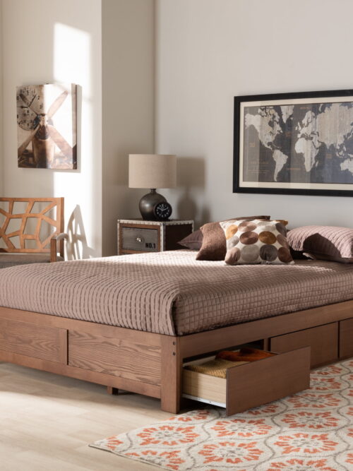 • Baxton Studio Wren Modern and Contemporary Walnut Finished 3-Drawer King Size Platform Storage Bed Frame