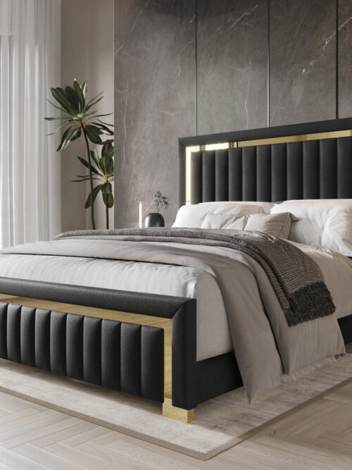• Home Design Olathe Queen Upholstered Panel Bed Frame with Channel-Tufted Headboard and Gold Acrylic Strip Accents, Black, Easy Assembly