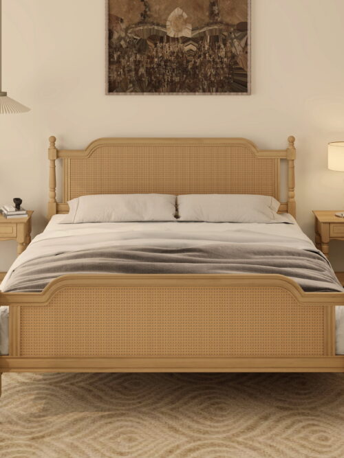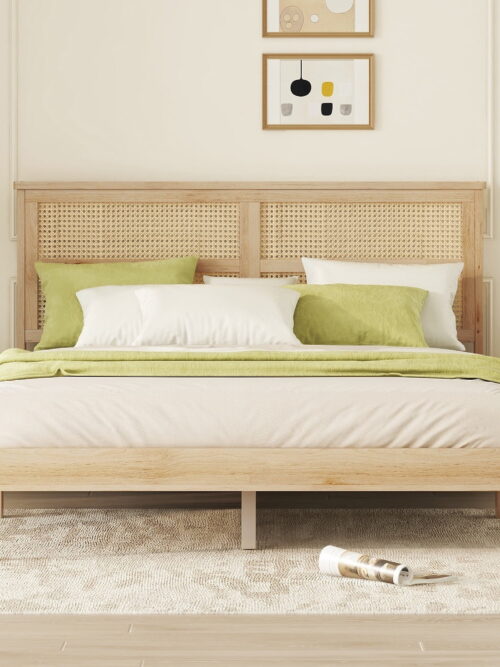 Miniyam Wood Queen Size Bed with with Rattan Headboard for Adult, Brown