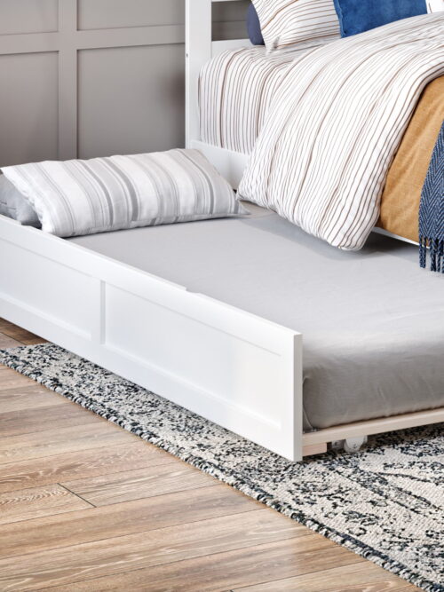 • AFI Twin-XL Roll Out Wood Trundle Bed Frame with Wooden Slat Supports, White