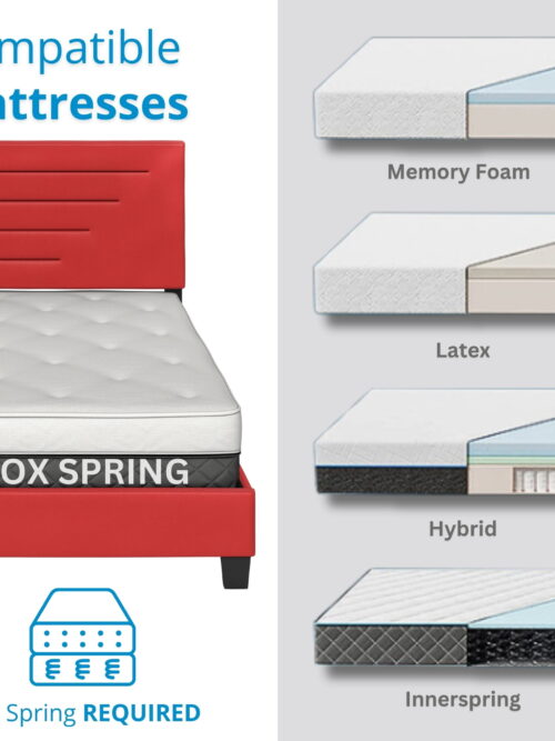 • Boyd Sleep Luxembourg Red Faux Leather Queen Size Fully Upholstered Platform Bed Frame with Adjustable Headboard, Qualified Box Spring or Foundation Required for Use