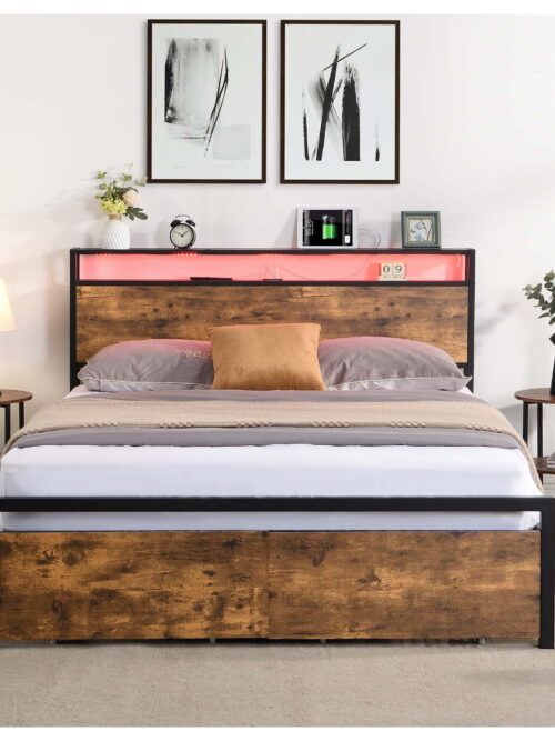• DEALTOPS Full Size Metal Bed with Storage Headboard and 2 Drawers, Platform Bed Frame with LED Lights, Charging Station, Brown