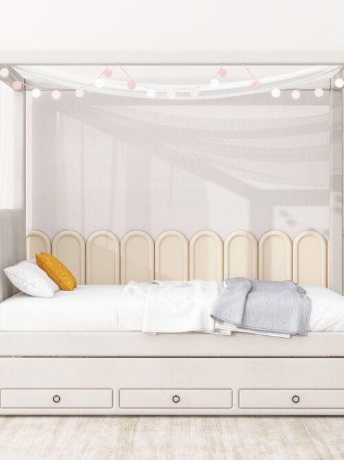 • EUROCO Upholstered Twin Size Canopy Bed Frame with Trundle Bed and 3 Drawers, Platform Bed with Headboard for Kids Teens Adults, Beige