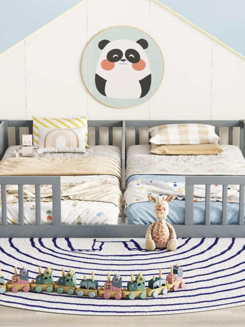 • PORKISS Twin Size Floor Bed for Kids, Double Wood Montessori Bed Frame with Fence, Grey